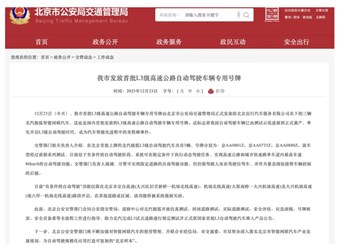 北京發(fā)放首批L3級(jí)高速公路自動(dòng)駕駛車(chē)輛專(zhuān)用號(hào)牌