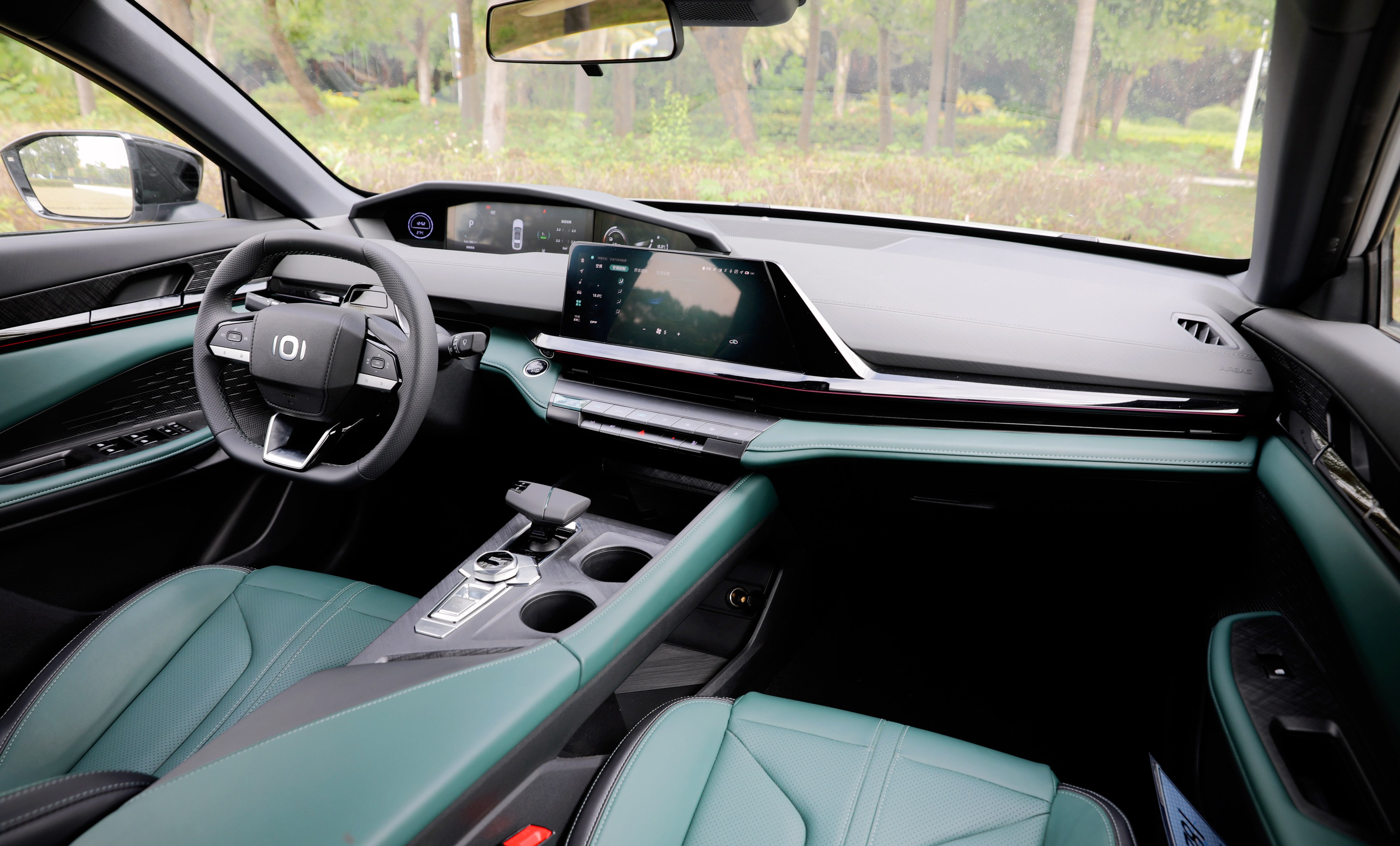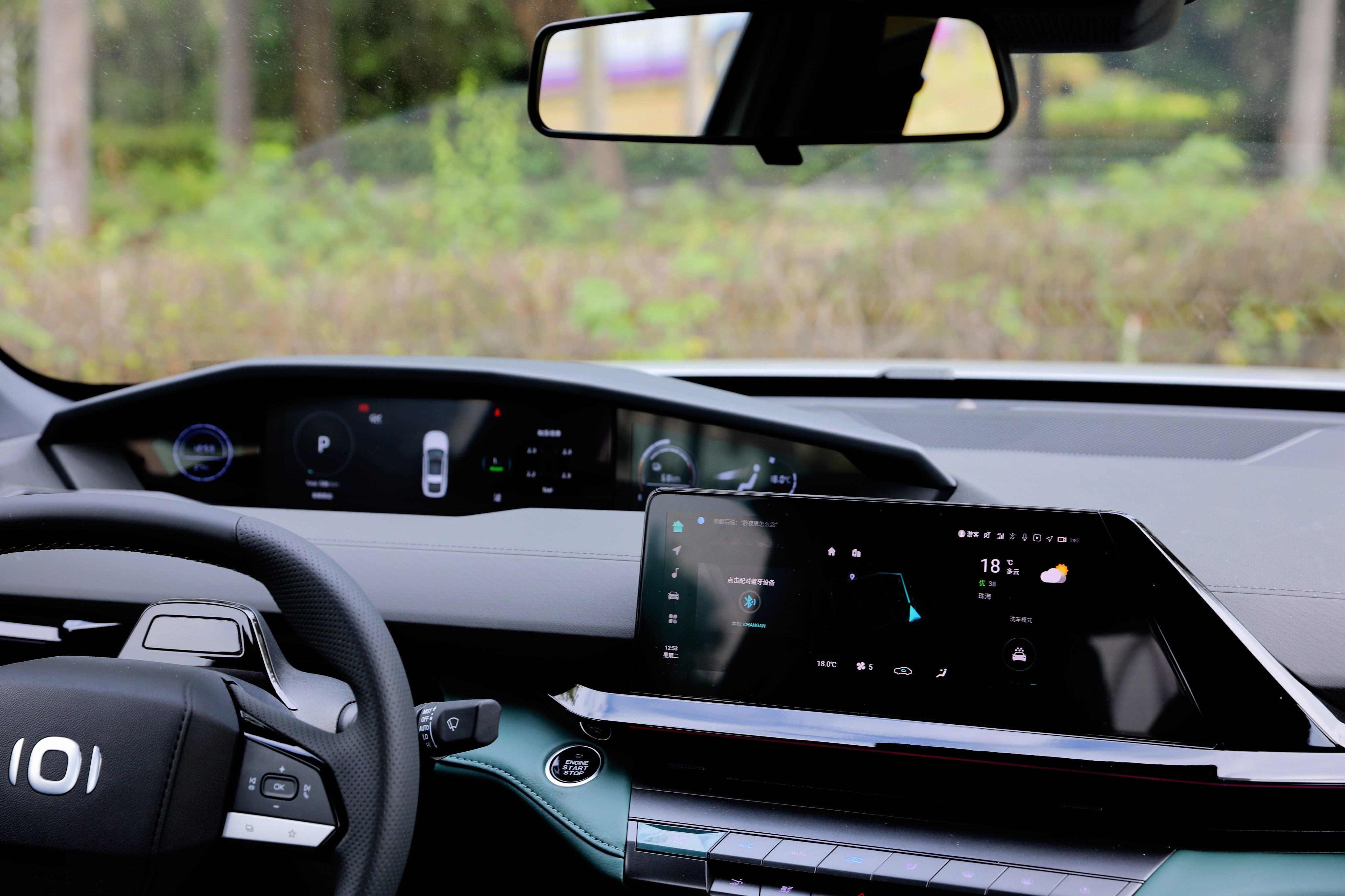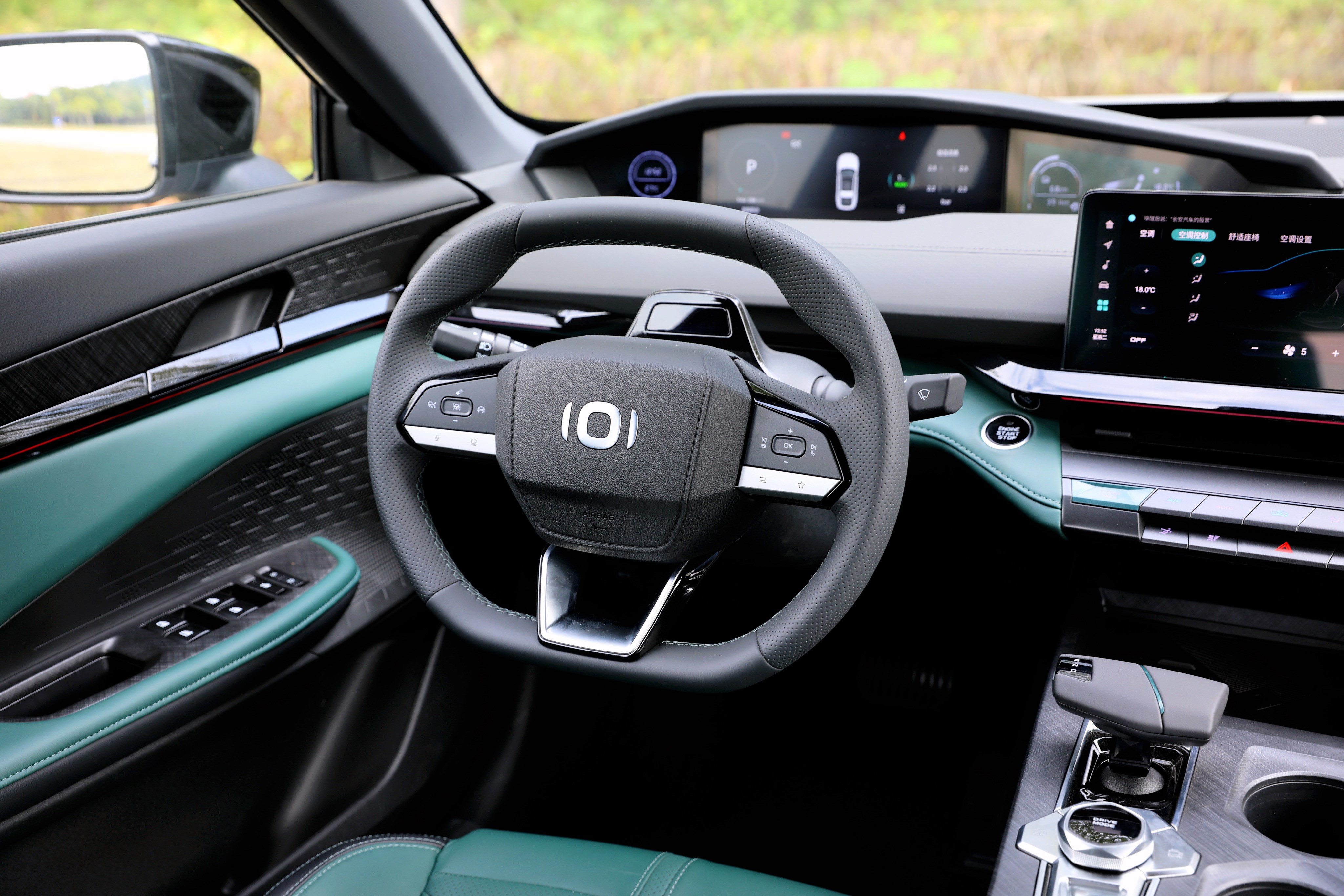 進(jìn)入車內(nèi),長安啟源A06座艙風(fēng)格很獨(dú)特,富有層次感的造型讓你第一眼會感覺很復(fù)雜,但是仔細(xì)品味一番后,它特殊的風(fēng)格可以說是別有一番風(fēng)味。啟源A06提供流沙白和林蹤綠兩種面料配色,個人更喜歡林蹤綠的配色方案,更能體現(xiàn)出動感、時尚的一面。