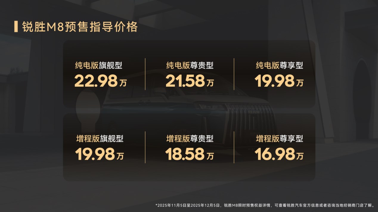 11月5日,作為北京汽車制造廠旗下專注MPV賽道的獨(dú)立品牌,銳勝汽車在青島召開“全場景·才是真舒享”銳勝M(fèi)8預(yù)售發(fā)布會。銳勝M(fèi)8提供多種動力版本,預(yù)售價格分別為:銳勝M(fèi)8-增程版169800元起,銳勝M(fèi)8-EV版199800元起。全系車型擁有多場景適用與經(jīng)濟(jì)實用性,兼顧越級空間及豐富配置,盡享三排都是商務(wù)艙的奢適感,給出了大型MPV高質(zhì)價比的新選擇。